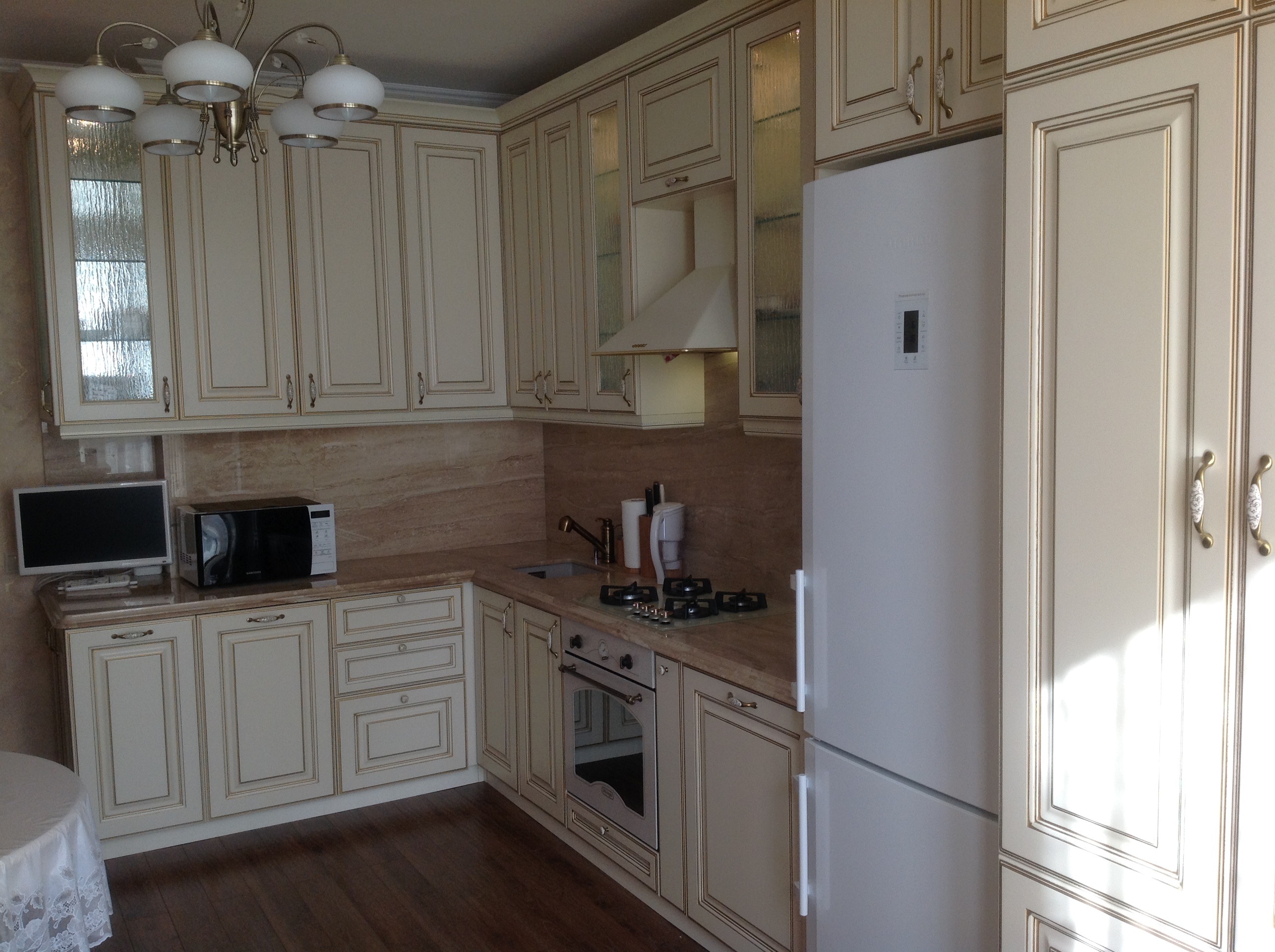 ДСП белое влагостойкое и ваниль EGGER, столешница мрамор Италия дайна с интегрированной мойкой, фасады дуб слоновая кость с золотой патиной Россия, ящики и бутылочница BLUM, ручки фарфор Италия.